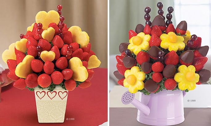 Well, *sniff, sniff* moving on to the Mother's Day idea. On the radio, on tv, everywhere I look I keep seeing one thing... edible arrangements. I would not be disappointed to receive one any day... but they are a bit pricey. I was going to display the DIY photo on here mixed in with the Edible Arrangement official photos and show you that you couldn't tell the difference, but there was an obvious difference. I don't think there has to be a difference, the DIY finished project just wasn't photographed as well. But don't they look so good and yummy?
